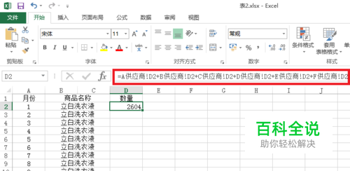 1.如图,要汇总各供应商各个月份洗衣粉的数量。 如果通过工作表找到D2单元格洗衣液的数量,然后把它一个一个加起来,工作量太大。方法如图所示。