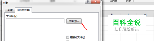 在新弹出的“对象”对话框中,先选择“由文件创建”选项卡,然后点击“文件名”后面的“浏览”,如下图所示: