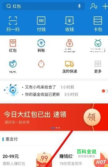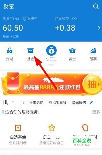 打开支付宝,如图在首页点击下方红色箭头所指“财富”,随后如图点击“基金”。