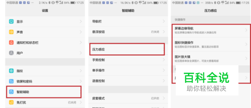 首先,开启压力感应。 打开【设置】>【智能辅助】>【压力感应】,根据想要使用的功能,依次开启。