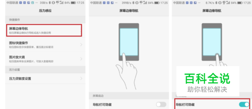 开启屏幕边缘导航 点击【屏幕边缘导航】,选择勾选上【导航栏可隐藏】和【代替虚拟导航栏】。 开启并隐藏导航栏后,手机界面上的导航栏就不见啦!取而代之的,是三个小白点,用来表明原来导航栏三个按键位置。