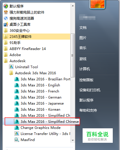 打开“开始”菜单,点击“所有程序”,在里面打开“Autodesk"——"Autodesk 3ds Max 2016",里面有个选项是“3ds Max 2016 - Simplified Chinese",如下图所示,打开即可。