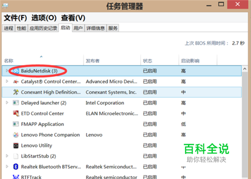 在所有开机启动项中,找到百度网盘启动项并点击它,然后点击右下角的“禁用”。如图所示: