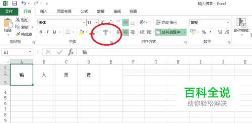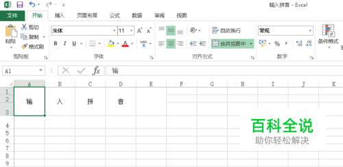 仍然以输入拼音四字为例,这种方法需要两行的单元格进行操作;