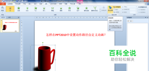 我们知道PPT制作时一般都要设置自定义动画,对于不同版本的PPT设置方法有所不同,低版本的PPT在操作时较为繁琐,高版本相对来说比较人性化。怎样在PPT2010中给一个对象设置动作路径动画呢?下面和初学者分享一下我的。