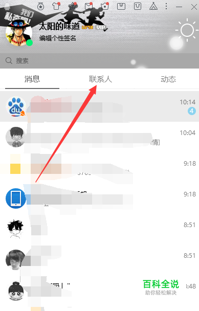 在电脑登录自己的QQ后,默认是进入到最近聊天页面,点击上方联系人标签,如下图。