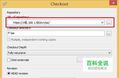 在弹出的对话框内,输入远端SVN的地址,以及本地要保存的目录,如果你想checkout某个具体版本,还可以在“Revision”里进行设置