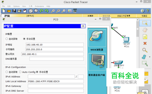 规划各台PC的IP地址,子网掩码和网关,并把它们配置在相应的PC里面,PC0的IP地址为192.168.40.10/24 192.168.40.1,PC11的IP地址为192.168.10.10/24 192.168.10.1,pc21的IP地址为192.168.20.10/24 192.168.20.1,pc31的IP地址为192.168.30.10/24 192.168.30.1,如下图所示:
