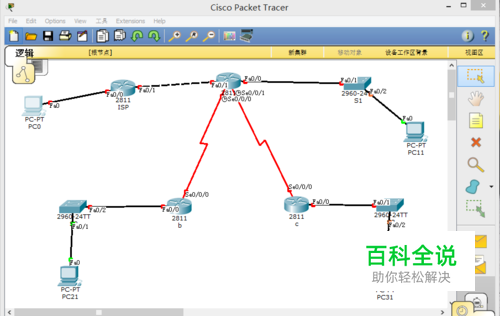 为各台路由器命名上相应的名字,命名路由器a的名字为a,路由器b的名字为b,路由器c的名字为c,路由器ISP的名字为isp,如下图所示: