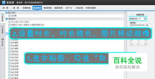 选中图片(使图片处于带边框的可编辑状态)。在“叠加素材”——“加贴图”列表,勾选“向上移动”。然后,在列表的右侧“持续时长”处,设置时长(时长越长,图片移动越慢)。