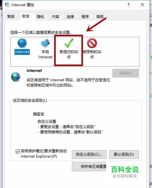 五、受信任站点 在上面的框框里找到【受信任站点】,点击选择。