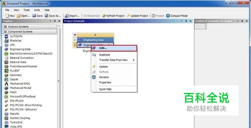 右键单击项目A中的A2,在弹出的对话框中左键单击“Edit”,进入Engineering Data编辑环境。