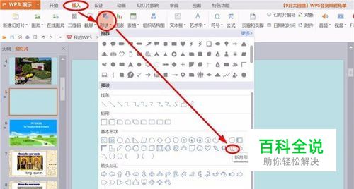 在文档中新建一张幻灯片后,点击菜单栏切换到【插入】菜单,点击插入下的【形状】,在自选图形中画出一个图形。