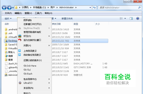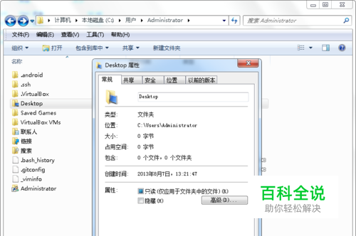 首先打开下面的目录:C:\Users\Administrator,然后选择Desktop,在上面点击右键,之后在弹出右键菜单中选择“属性”