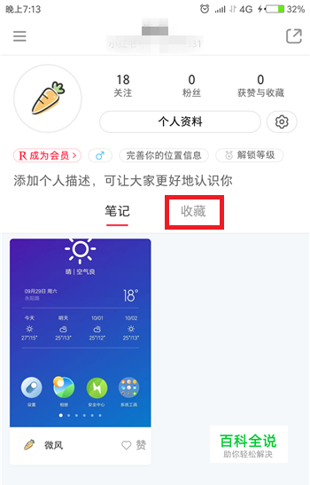 点击后会打开小红书的个人中心,在账号下方找到【收藏】选项并点击。