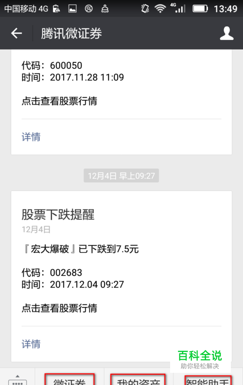 进入腾讯微证券的界面。菜单栏中有微证券,我的资产,智能助手这几个栏目。