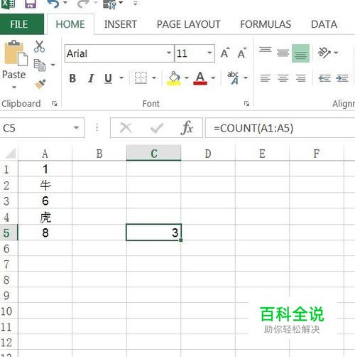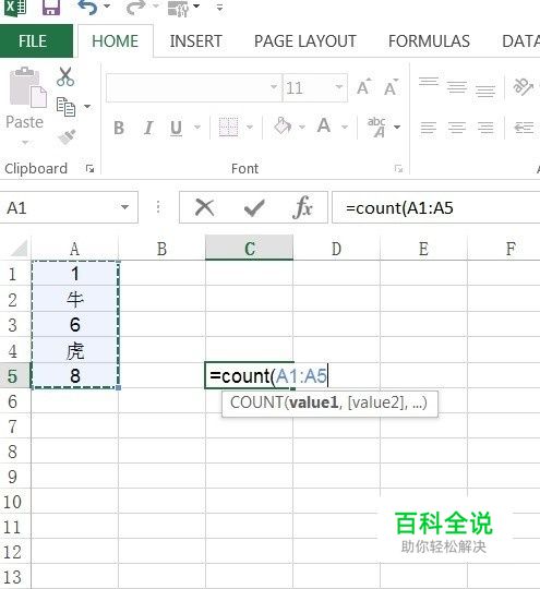count是"计数"的意思,即用来计算包含数字的单元格的个数.如下图,我们想要计算A列中有几个数字,那么就选一个空白单元格,然后输入"=count(A1:A5)".