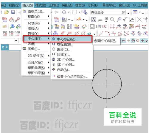 鼠标点开快捷图标“中心标记”旁边的小倒三角形,会弹出一列表(这和从插 入菜单中选用相应命令是一样的),选择“圆形中心线”。这个就是专门用来生成带有点划线圆形的命令。