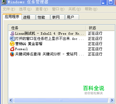 出现问题现象,是打开过很多任务。但是 任务栏就是不显示打开的项目,但是用TAB+ALT 或者任务管理器 应用程序里面可以看到任务项目。如下图: