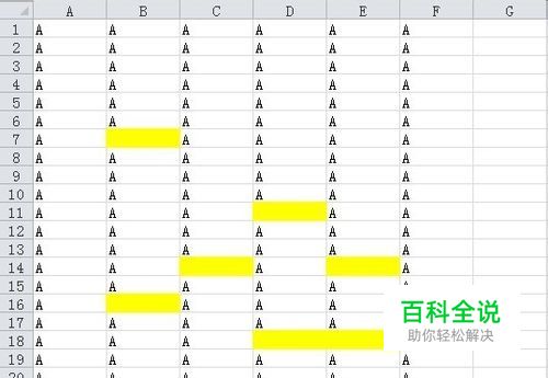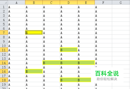 如下图所示,黄色单元格为单元格区域中的空白值,我们如何快速找到它们并填充数据,如填充B。效果如下图所示。
