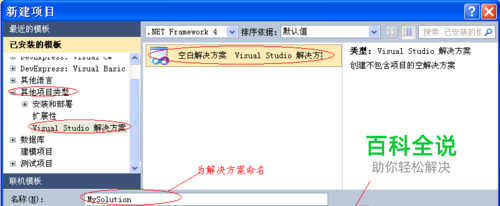 在“新建项目”对话中,选择“其他项目类型”中的“Visual Studio 解决方案”,设置解决方案的名称,并设置解决方案存放的位置,点击“确定”,这样就创建了一个空的解决方案