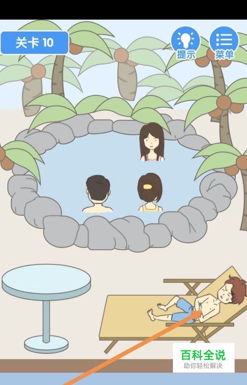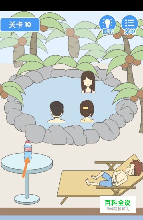 男主喝完水后,点击温泉,然后将空瓶子拖动到男主身上就过关了。