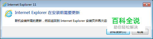 程序会自动检测当前系统是否需要安装补丁,需要的话会弹出需要联机更新的页面。因现在安装的电脑不能上网。所以接下来我们要下载ie11相应的升级包。点击【获取更新】按钮,将在浏览器中打开一页面。