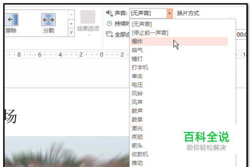 若想要撤消此音效;我们可以再点开“切换”选项卡,然后在“声音”右侧的小三角点下,在弹出的下拉菜单中点“无声音”即可。