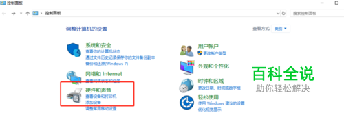 选择控制面板列表下的 硬件和声音,点击并打开 。