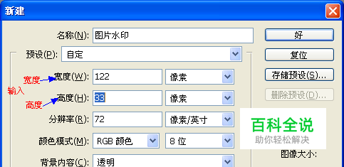 在弹出的“新建”对话框中输入图片的名称,然后输入图片的宽度和高度,非常重要的是,最下面的“背景内容”,这里我们要选择“透明”,所以填完之后,点击右上角的“好”