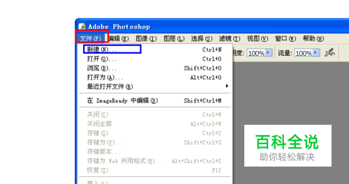 首先做一张要添加到别的图片上面的“水印图片” 打开Photoshop软件,选择菜单栏上面的“文件”,然后再弹出的列表菜单中选择“新建”