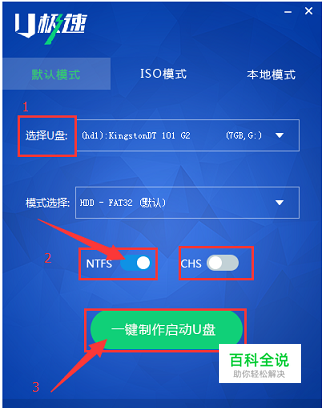 打开“U极速”启动U盘制作软件,等待界面上显示出"请插入需要制作启动盘的U盘"提示时插入准备好的U盘,然后对界面做如下图的选择: