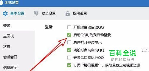 然后在右侧的窗口中找到并勾选“启动QQ时为我自动登录”前面的复选框。最后点击确定按钮。这样我们的QQ就会自动的登录了。