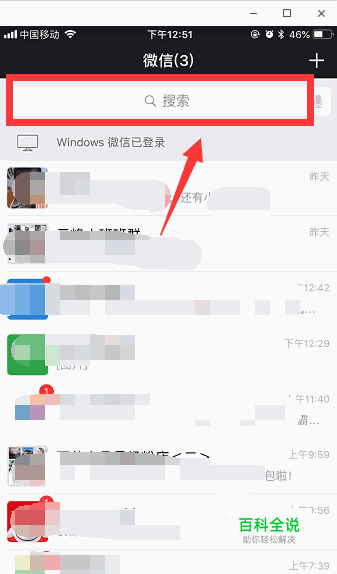 打开微信,在顶部用手指向下划一下,出现一个搜索框,点击一下搜索框。