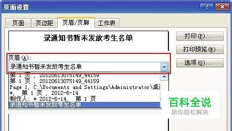 编辑好后点击“确定”即完成了页眉的设置,在页面设置窗口的预览区域可以看到设置效果,也可以点击“打印预览”查看打印效果。