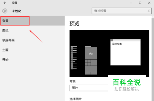 在这里可以对背景、颜色、锁屏桌面、主题和开始进行设置,在这里我们需要点击【背景】