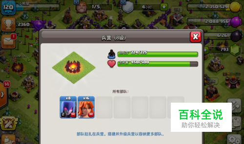 兵营配置。首先我们在兵营中训练16个女武神,剩下的空间我们训练满人口的女巫。因为有大量骷髅兵,所以尽量选择范围攻击的兵种。