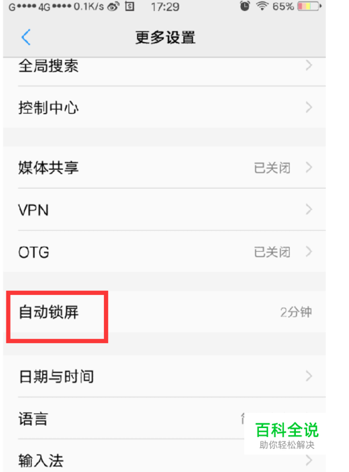 下滑,找到“自动锁屏”,可以选择15s到30分钟之间的不同时间。