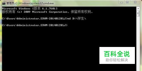 如果是想在D盘上建立一个名叫“学生”的文件夹就在后面输入命令 md D:\学生\,然后按enter键。这样就创建好了