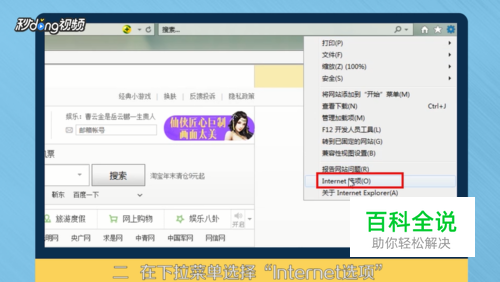 在IE浏览器界面点击右上角的设置图标,在下拉菜单选择“Internet选项”。