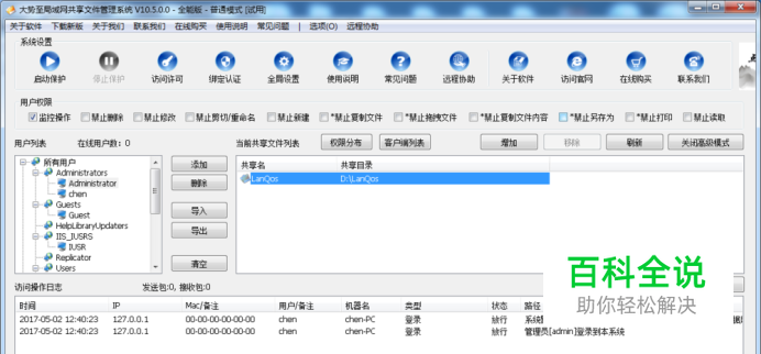 经过以上操作后,就完成了“CCE”共享文件夹的“cceuser”用户的访问权限设置,其它用户的共享文件夹访问权限设置方法是相同的,就不再赘述。 3.通过共享文件管理软件来加强共享文件访问权限管理 除了通过操作系统的共享文件访问权限设置,你也可以通过安装一下共享文件管理软件、局域网共享权限设置软件来实现。例如有一款“大势至局域网共享文件管理系统”(下载地址:http://www.grabsun.com/gongxiangwenjianshenji.html),只需要在服务器上安装,就可以自动扫描到当前服务器所有的共享文件和服务器上的所有账户,然后就可以选择特定的共享文件夹,再勾选相应的账号,并勾选相应的访问权限,就可以为共享文件设置操作系统全线之外的额外访问权限控制。比如,禁止删除共享文件、禁止修改共享文件、禁止复制共享文件、禁止共享文件另存为本地磁盘、禁止打印共享文件以及禁止拖拽共享文件等,尤其是可以实现只让读取共享文件而禁止复制共享文件、只让修改共享文件而禁止删除共享文件、只让打开共享文件而禁止另存为本地磁盘等,上述三个功能是操作系统和windows域账号无法实现的,可以极大地保护服务器共享文件的安全。如下图所示: