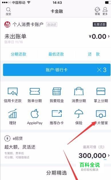 登录掌上生活,在“卡金融”中找到并点击“卡片管家”;