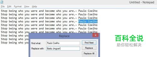 操作:按下ctrl+z键 作用:返回上一步 说明:比如说我刚才在第3部将全文中所有的Paulo Coelho替换成了Baidu Jingyan, 但是在替换之后,我发现我不想替换了或者是Baidu Jingyan不是我想替换的话,可以按下ctrl+z键返回上一步操作之前。