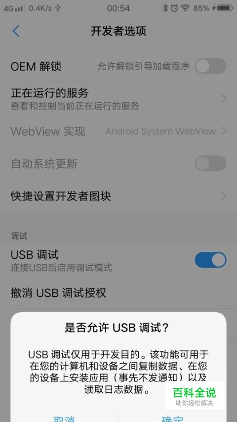 然后我们需要开启手机“USB调试”功能,使得手机在连接USB后可以启动调试模式。