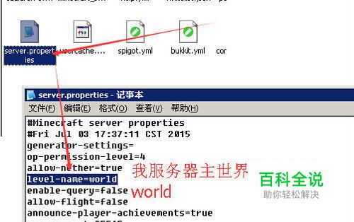 查看你服务器主世界的名字 用记事本打开服务器目录中的【server.properties】文件,找到【level-name=】那一行,查看等号后面的英文名字。 我这里是world,我服务器的主世界叫做world,默认的就是这个英文。如果你改动过,那么就记住你的那个英文。