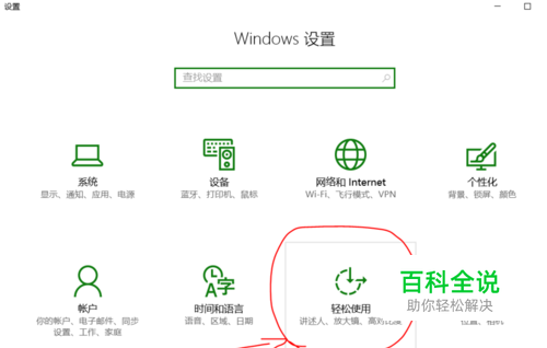 首先打开电脑的 设置界面,选择 轻松使用选项
