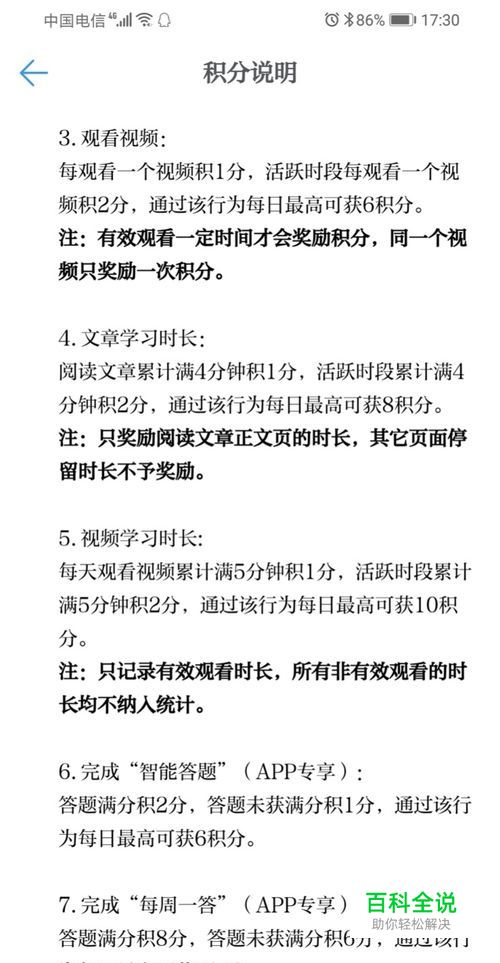 手机APP端专享任务详解及攻略: 「智能答题」:答题满分得2积分,答题未获满分得1积分,5题一组,每道题下面都有答案,不要求正确率,答了就有1积分,快答即可,一天最多6积分。 「每周一答」:5题一组,每周一套,每月就四套题,每道题下面都有答案,重复答题不得分,一天只做一套就够,做多了不计分,还浪费了你以后用这套题积分的机会。要从旧往新做,否则随着题库更新,过去的就没有了。答题满分得8积分,答题未获满分得6积分,重复答题不得积分,要答对3道才有积分,一天最多8积分。 「专题考试」:10题一组,不定期更新,每道题下面都有答案,重复答题不得分,一天只做一套就够,做多了不计分,还浪费了你以后用这套题积分的机会。要从旧往新做,否则随着题库更新,过去的就没有了。考试满分得10积分,考试及格以上但未获满分得8积分,重复考试不得分,不及格不得分,要答对6道才有积分,一天最多10积分。 「订阅」:订阅一个强国号或者学习平台得1积分,订阅后再取消不影响积分,重复订阅不得分,一天订阅2个,不要多订,订完为止,一天最多2积分。全订满了就取消掉重新开始。 「收藏」:每收藏2次得1积分,随便收藏2篇即可,一天最多1积分。收藏后在删除不影响积分,可以同一篇文章反复收藏。 「分享」:每分享2次得1积分,一天最多3积分。分享只要进入到微信或者钉钉等的分享的界面而不必确定对象就算分享成功,计分,同一篇文章可反复分享,最好是一篇文章分享2次换一篇。 「发表观点」:每发表一个有效观点得1积分,最少要5个字才算是有效观点,同一篇文章可连续评论5次,内容尽量不重复,一天最多5积分。 注意,所有的答题注意不要漏字少字错字,有引号的要加引号。以上是手机APP专享,最多共计35分。如果挨个按要求做,耗时约30分钟,当然如果手速快反应快,15分钟搞定很正常,做习惯了会越来越快,O(∩_∩)O~。 算上步骤2,全部任务做对做完--66分!