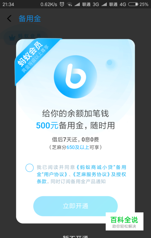 找到备用金后进行点击进去界面,一些备用金的介绍和服务条款,进行勾选同意后进行申请使用备用金立即开通,如图所示。
