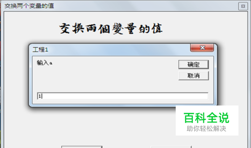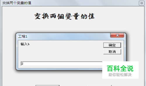 双击command1进入代码区域,在代码区域中对象选择command1,过程选择click,然后输入代码为: Dim a As Integer, b As Integer, c As Integer a = Val(InputBox("输入a")) b = Val(InputBox("输入b")) Me.Print "交换前:a= "; a, "b="; b c = a a = b b = c MsgBox "交换后a=" & a & "b=" & b, vbOKOnly, "交换结果"
