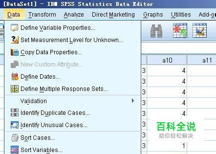 打开spss以后,先要打开第一个要合并的数据,然后合并变量如图所示,在菜单栏上执行:data--merge file--addvariable